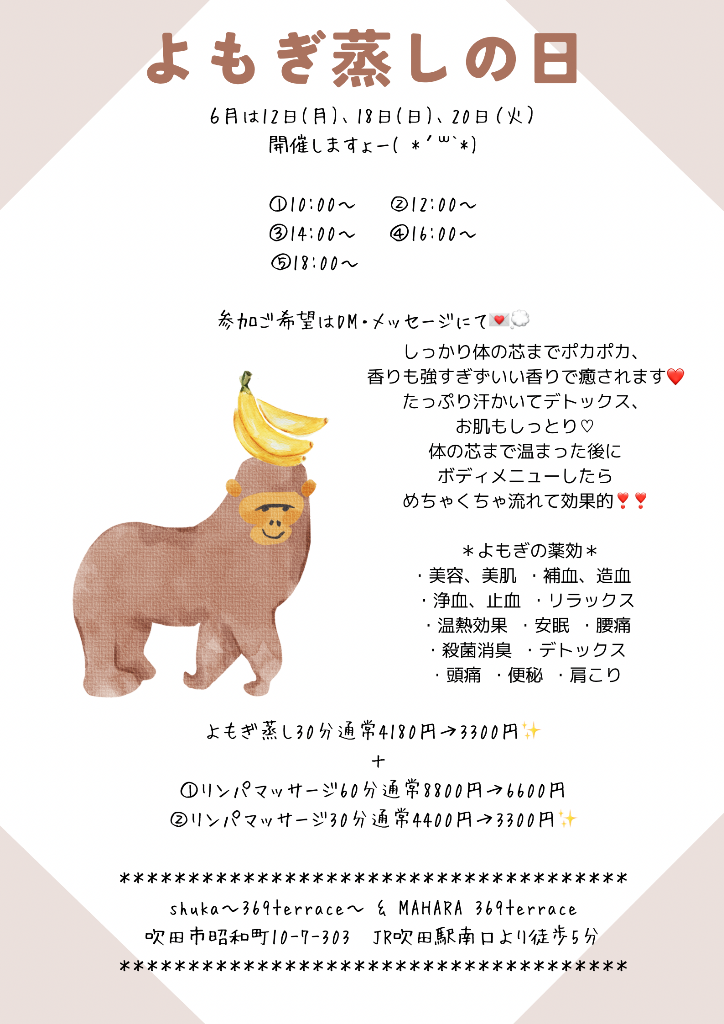 よもぎ蒸し30分4400円+リンパマッサージ60分通常8800円を→6600円にて